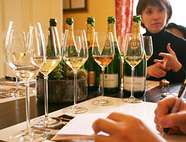 シャンパーニュを訪れてはじめてのデギュスタシオン(*)は、朝10時からはじまった。2月とは思えない豊かな太陽の微笑が、清潔感溢れる可愛らしい洋館の2階、デギュスタシオン用の部屋に差し込んでくる。プレス担当のマドモアゼル・オードリーが最初の1本をグラスに注いでいく。