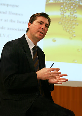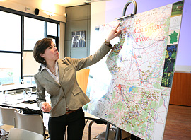 今回の巡礼を見守ってくださったプレス担当のフィリップ・ウィブロット氏。C.I.V.Cの世界的な活動についてレクチャーいただいた。 そこでフランス国内はもとより、世界中でシャンパーニュを守り、広げていく活動をしているのが『Comite Interprofessionnel Du Vin De Champagne』(シャンパーニュ地方ワイン生産同業委員会)、C.I.V.C.だ。エペルネに本部を置き、日本など世界に事務局を設置しているこの委員会に、シャンパーニュ滞在中大変にお世話になった。それは我々が想像していたよりもはるかに手厚く、そして熱心なものだった。サロン/ドゥラモット、パイパー・エドシック、ルイ・ロデレールへの訪問をアレンジしていただき、またランチ、ディナーを通じて食とシャンパーニュ、シャンパーニュの文化を体感させていただいた。我々が自由に動き回る日は、それはそれで意義深い体験だったが、C.I.V.C.の方々と過ごした時間は、身が引き締まり、シャンパーニュに対して真剣に向き合う素晴らしいものだった。