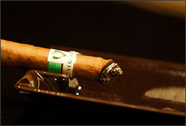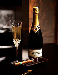 シガーの吸い始めは香りがライト。ハーブのようなフレッシュな香りが特徴です。フット(火をつける先端部分)からヘッド(吸い口部分)が長いため、フィルターの役目をしてくれるんです。ですので辛口のシャンパーニュによく合いますよ。例えばデュバル・ルロワ ブリュット。ピノ・ノワール75%、シャルドネ25%からなる蜜のような繊細な味わいが絶妙なマリアージュになります。 シガーの煙は口の中で燻らせることでその香りを充分楽しむことができます。タバコのように肺には入れず、口の中でゆっくりと煙をたたせるのがポイントなんです。吸い始めの30分、ライトな香りとブリュットの組み合わせを存分に楽しんでみてください。  |