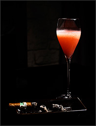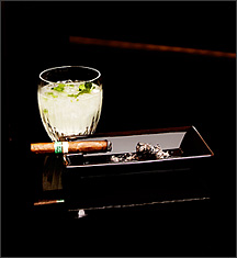 吸い始めから約60分、中盤にさしかかると、徐々に香りが濃くなってきます。シガーの香りの変化が楽しめる時ですのでゆっくりと時間を過ごしましょう。このタイミングでは香りの濃さを中和させるような甘味系シャンパーニュが欲しい所ですね。そこで次の一杯としてオススメしたいのがシャンパンモヒートとの組み合わせです。 シャンパンモヒートはご存知のようにラムベースのカクテルにシャンパーニュを加えた人気のカクテルです。ミントの香りと爽やかなテイストが中盤のシガーの香りにベストマッチ。ちょっとセレブな気分に浸って素敵な時間を満喫しましょう。  |