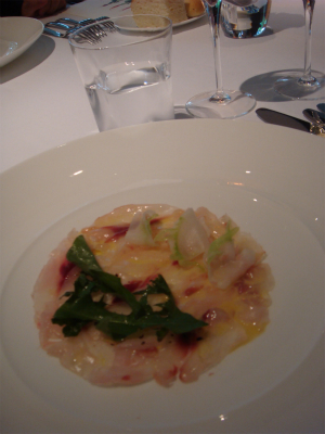 前菜は真鯛のカルパッチョ、ソース"JAPANICE"