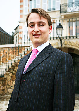 ランスの無国籍的フレンチにてヴィアネイ・ファーブル氏を囲む、筆者、そしてシュワリスタメンバーたち。80's、90'sのチャート系音楽が心地よく響く空間で、ボランジェ スペシャル・キュヴェも進む。この時点で2本目が空いている。 彼はここランスに住み、車で30分かけてアイ村にあるボランジェ社に通っている。素朴で、5、6軒ほどのレストラン、しかも日曜日にほとんどの店が休むというアイ村と比べて、ランスは大都会だ。そして、よく磨かれたモダンな革靴、シャープで軽快なピンストライプのスーツを着こなす彼の姿もやはり都会的だ。