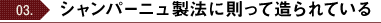正式に「シャンパーニュ」って名乗れるのは、フランス産だけ! シャンパーニュと名乗るためには左の3つ、全てを満たす必要があります。 |