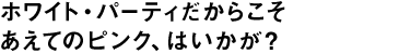 ゲストの素敵な「something white!」を引き立てるために、シャンパーニュで「差し色」を。白い洋服やアクセサリーに白いシャンパーニュでは、色のメリハリもつきにくいものです。そんな時は透明ボトルのロゼを選ぶのが効果的。見た目はもちろん、クリアボトルのロゼは見た目どおりにベリーやフルーツを感じさせるものが多いので、飲んだあと、口に余韻が残りながらも後味、さっぱり。これもホワイト・パーティのチョイスとしてぴったりです。